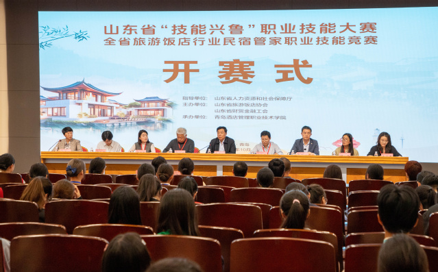 中国旅游饭店业协会副会长、山东省旅游饭店协会会长何庄龙,中国旅游协会民宿客栈与精品酒店分会会长张晓军、副会长兼秘书长穆晓雪,山东省文化和旅游厅二级调研员司琰,青岛市文化和旅游局一级调研员孙佩川,青岛市文化和旅游局市场管理处王琳娜,学校副校长张宗国参加开赛式。