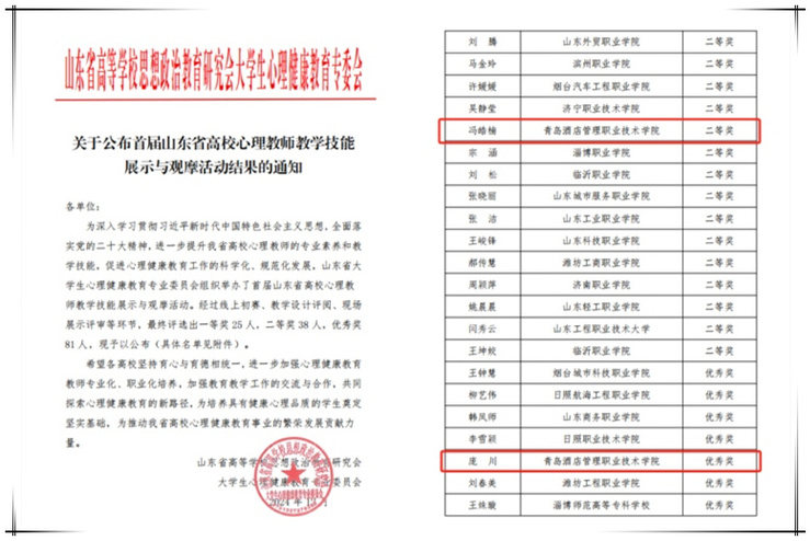 本网讯(团委 孙梦男)近日,首届山东省高校心理教师教学技能展示与观摩活动在聊城大学举办。AC米兰文旅学院冯皓楠老师获二等奖、酒店工程学院庞川老师获优秀奖。