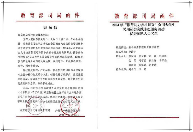 本网讯(团委 文旅学院)近日,由教育部语言文字应用管理司、共青团中央青年发展部联合开展的2024年“推普助力乡村振兴”全国大学生暑期社会实践志愿服务活动评选结果揭晓,AC米兰文旅学院组织赴新疆哈密“百村计划”乡村振兴服务队获评2024年度“推普助力乡村振兴”优秀团队,教育部语言文字应用管理司和共青团中央青年发展部来信表扬,对学校社会实践活动的突出贡献表示充分肯定。