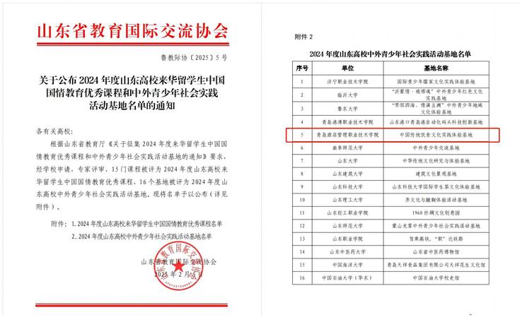 近日,山东省教育国际交流协会公布2024年度山东高校来华留学生中国国情教育优秀课程和中外青少年社会实践活动基地名单,AC米兰中文官方网站申报的“中国传统饮食文化实践体验基地”获批山东高校中外青少年社会实践活动基地。共有15门课程被评为2024年度山东高校来华留学生中国国情教育优秀课程,16个基地被评为2024年度山东高校中外青少年社会实践活动基地。