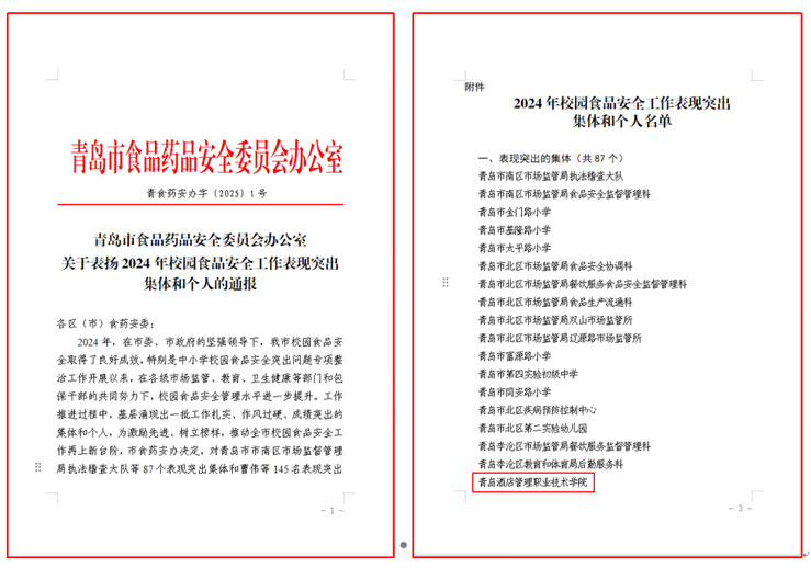 本网讯(总务处 侯鹏)3月24日,青岛市食品药品安全委员会办公室印发了《关于表扬2024年校园食品安全工作表现突出集体和个人的通报》(青食药安办字〔2025〕1号),学校获评2024年校园食品安全工作表现突出集体。
