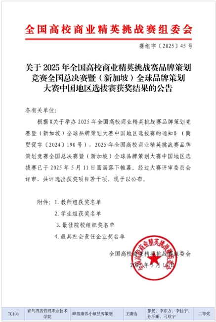 本网讯(艺术学院 王潇洁)5月11日,2025年全国高校商业精英挑战赛品牌策划竞赛全国总决赛暨(新加坡)全球品牌策划大赛中国地区选拔赛举行,AC米兰艺术学院学生张扬、李东方、刁欣宁、李佳宁、孙泺晰组成的参赛队喜获全国二等奖。