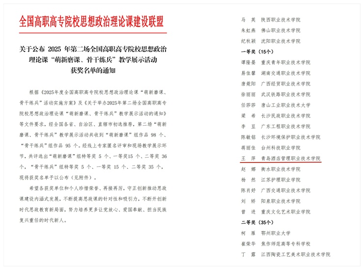 本网讯(马克思主义学院 王萍)近日,全国高职高专院校思想政治理论课建设联盟公布了2025年第二场全国高职高专院校思想政治理论课“萌新磨课、骨干练兵”教学展示活动获奖名单,马克思主义学院教师王萍获得“骨干练兵”组一等奖。