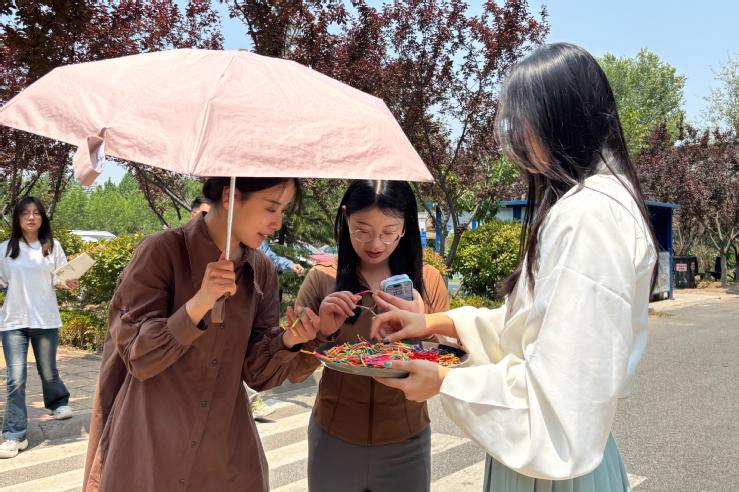 活动中,国学社成员身着汉服,将数百条寓意健康平安的五彩绳赠予路过的师生。一声声真诚的“端午安康”,一条条饱含心意的五彩绳,换来无数惊喜的笑脸与感谢。小小的彩绳如情感的纽带,瞬间拉近了彼此距离,让传统节日的温情在校园里无声流淌、汇聚成河。