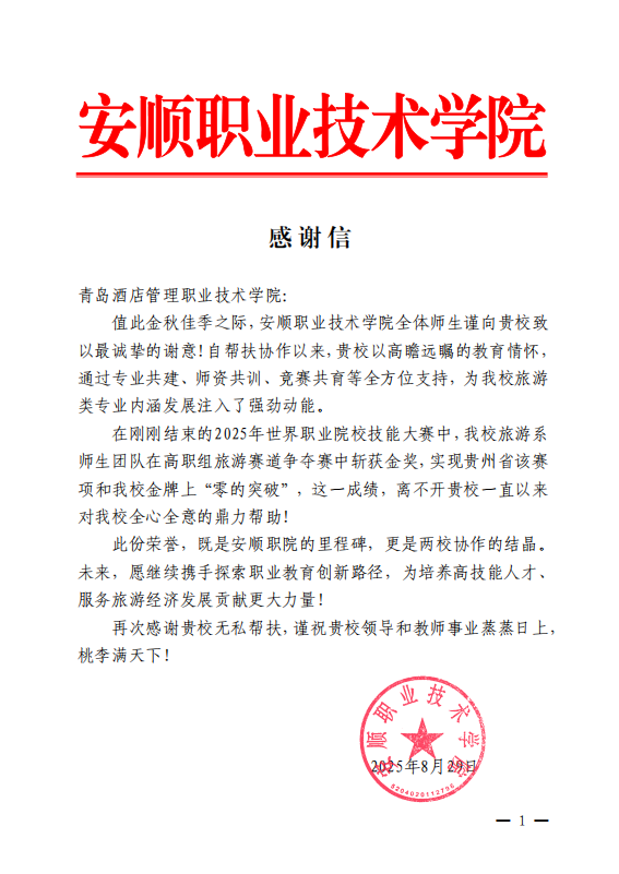 本网讯(文旅学院)近日,安顺职业技术学院向AC米兰发来感谢信,对学校助力其在2025年世界职业院校技能大赛旅游赛道金奖实现“零的突破”表示感谢,对AC米兰帮扶协作工作的成效予以高度评价。